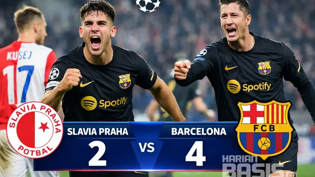 Barcelona sempat tertinggal lebih dulu dari Slavia Praha melalui gol cepat Vasil Kušej pada menit ke-10, namun Barca segera bangkit lewat dua gol dari Fermín López sebelum jeda. Dani Olmo dan Robert Lewandowski memperlebar keunggulan di babak kedua, memastikan tiga poin penting bagi tim tamu meskipun Slavia sempat menyamakan kedudukan untuk sementara saat babak pertama berakhir.