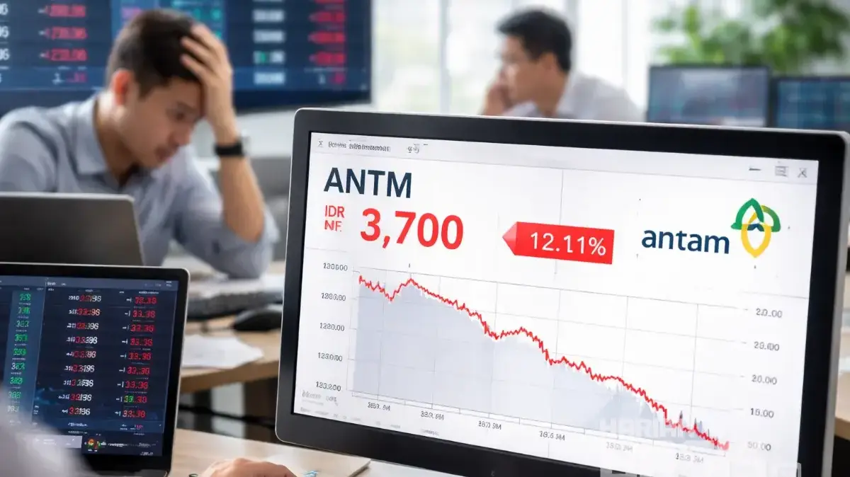 Saham ANTM hari ini mengalami penurunan tajam hingga lebih dari 12 persen dan ditutup di level Rp3.700 per saham. Tekanan ini dipengaruhi oleh kombinasi sentimen global, aksi profit taking, serta kondisi pasar saham yang belum sepenuhnya stabil.